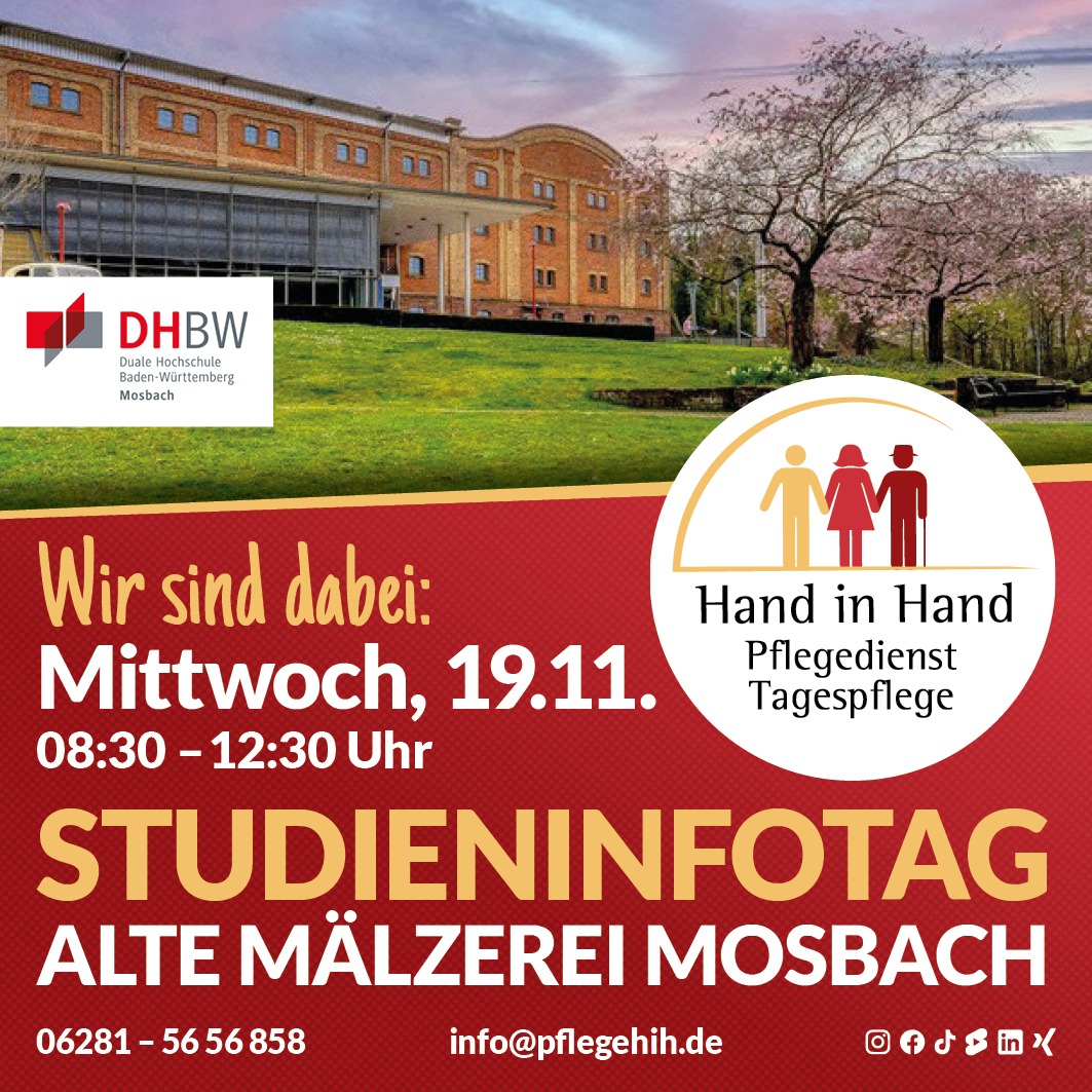 EINTRITT FREI: Wir sind am Mittwoch, 19.11.2025 von 8:30 bis 12:30 Uhr im Kulturforum Alte Mälzerei in Mosbach beim Studieninfotag der DHBW Mosbach für euch da. Lernt uns und unser vielfältiges Angebot kennen!