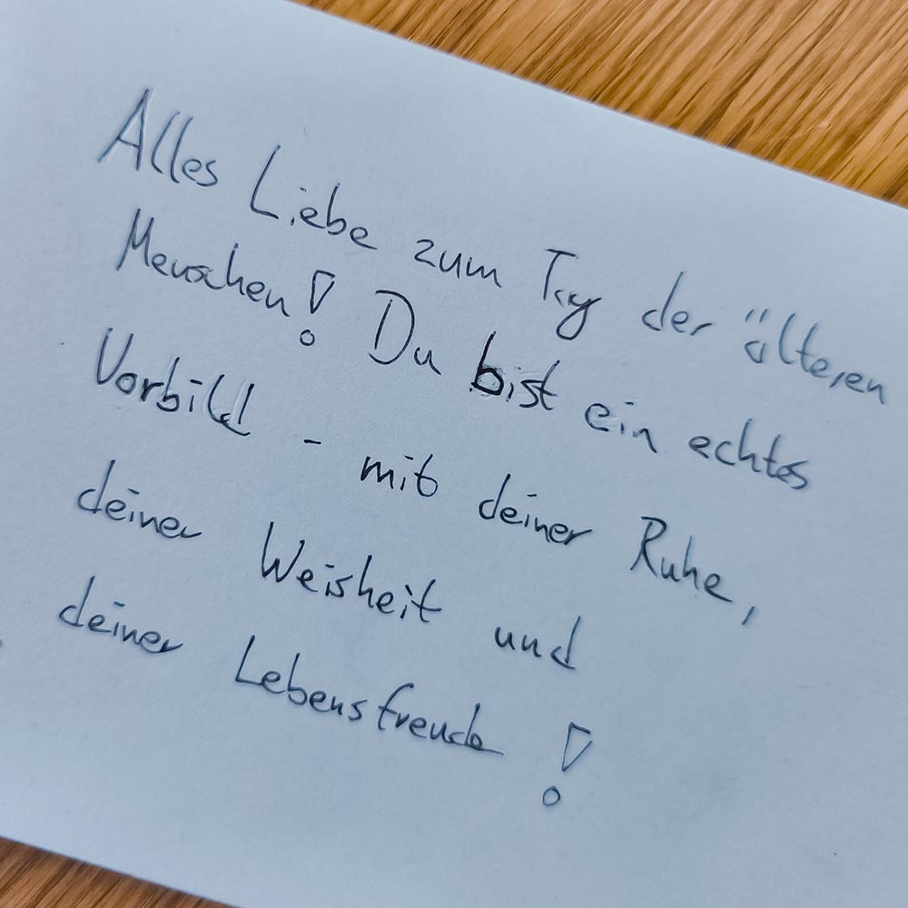 Die handgeschriebenen Karten der Schülerinnen und Schüler zum internationalen Gedenktag für die Belange älterer Menschen rührte unsere Gäste teils zu Tränen. Wir haben uns wirklich sehr über diese Geste gefreut. Vielen Dank auch an Frau Seitz, die uns die Karten gebracht hat.