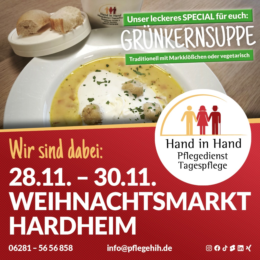 Schauen Sie auch mal an unserem Stand vorbei und genießen Sie eine leckere, heiße Grünkernsuppe – traditionell mit Markklößchen oder vegetarisch.